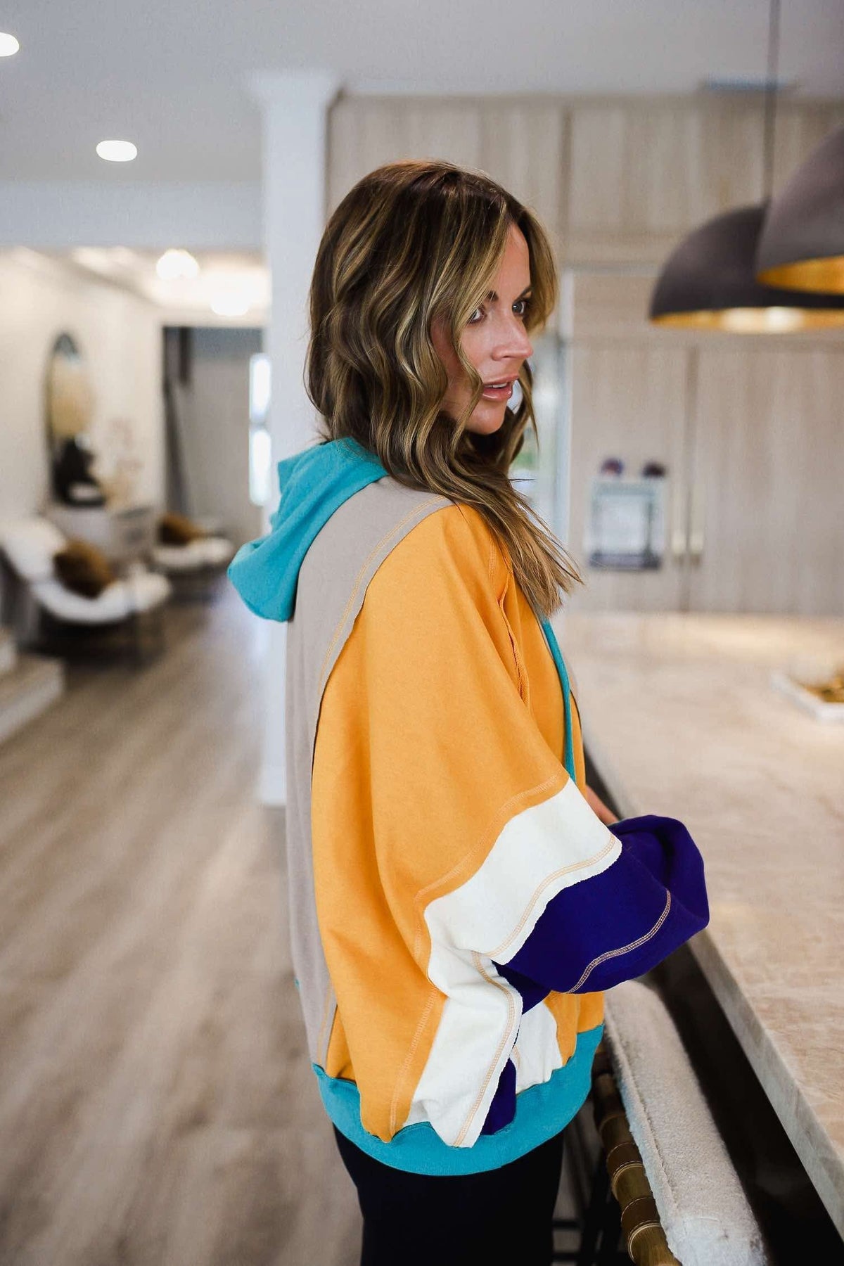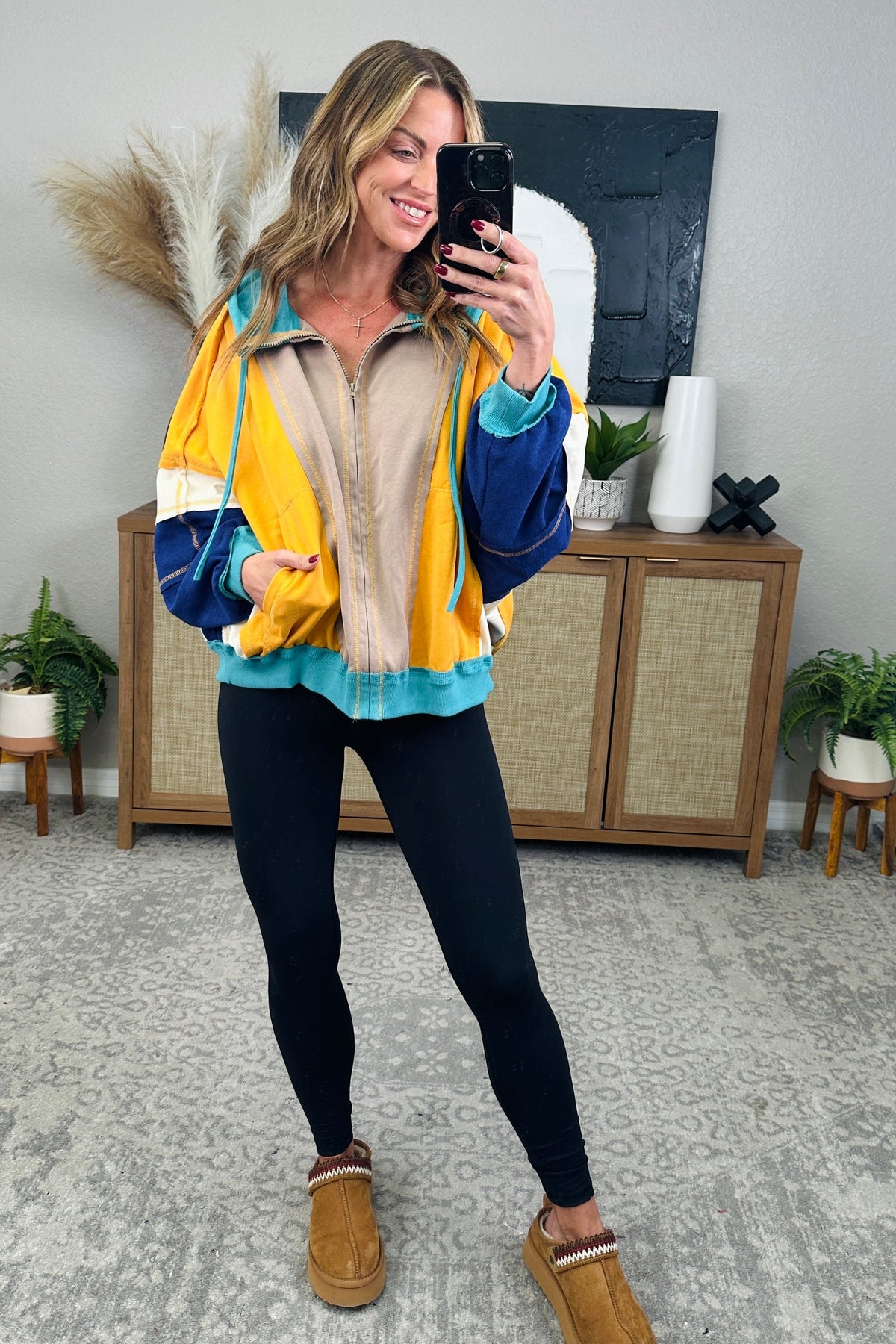 Stay cozy in style with our Double Take Full Size Color Block Zip Up Hoodie! This hoodie features a color block design and a convenient zip up closure. Perfect for chilly days or lounging around the house. Upgrade your wardrobe with this stylish and fun hoodie. The model is in the small.