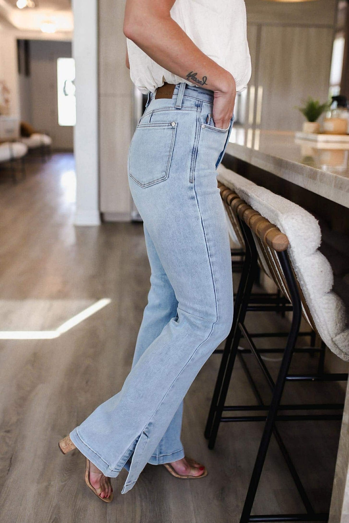 Tummy Control Vintage Wash Side Slit Slim Boot Jeans offer a stylish and flattering option for those seeking a combination of comfort and style. These jeans feature a vintage wash that gives them a classic and timeless look, while the tummy control feature helps to smooth and shape the midsection for a slimming effect. The slim boot cut style is modern and versatile, offering a balanced and flattering silhouette. The side slits add a trendy touch and create movement and interest in the design. The model is a 4 wearing the 3. You can size down one from your even size.