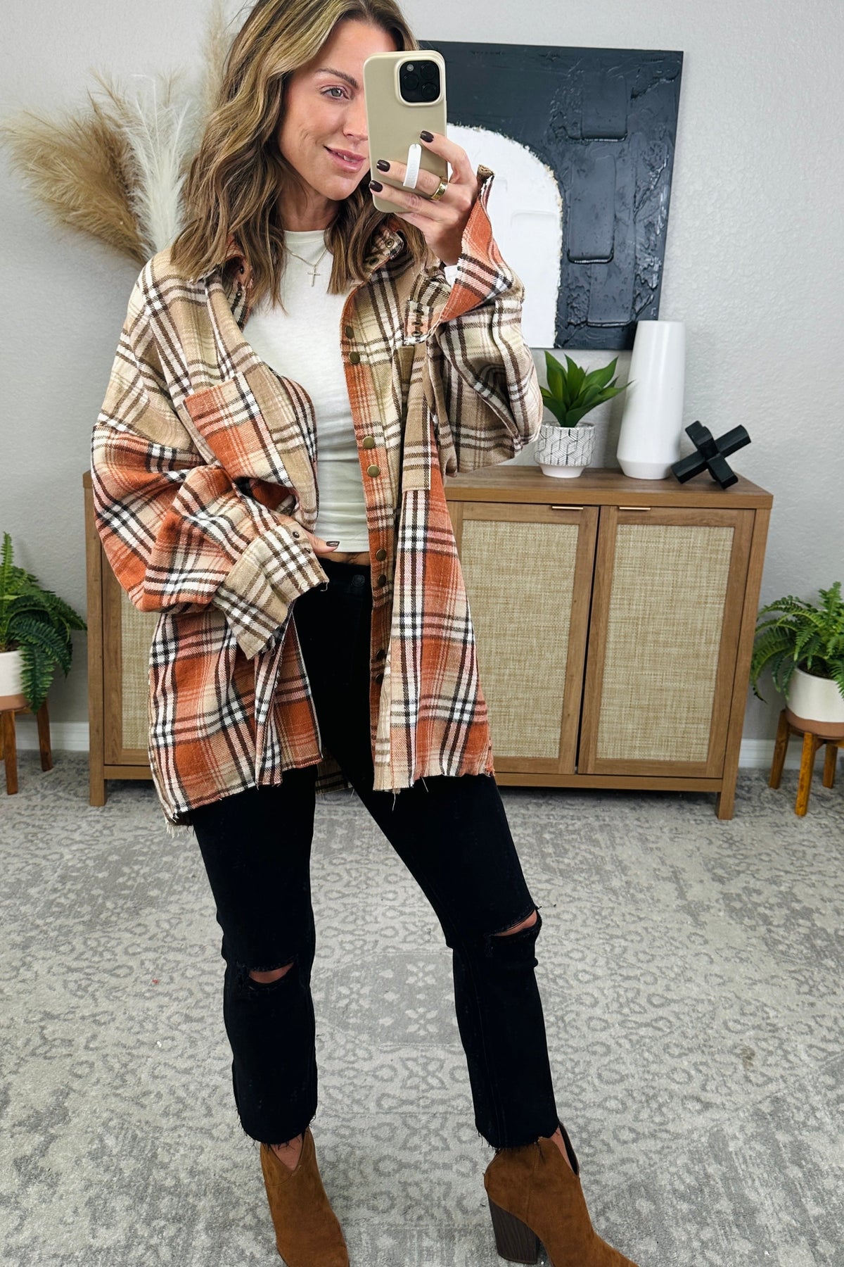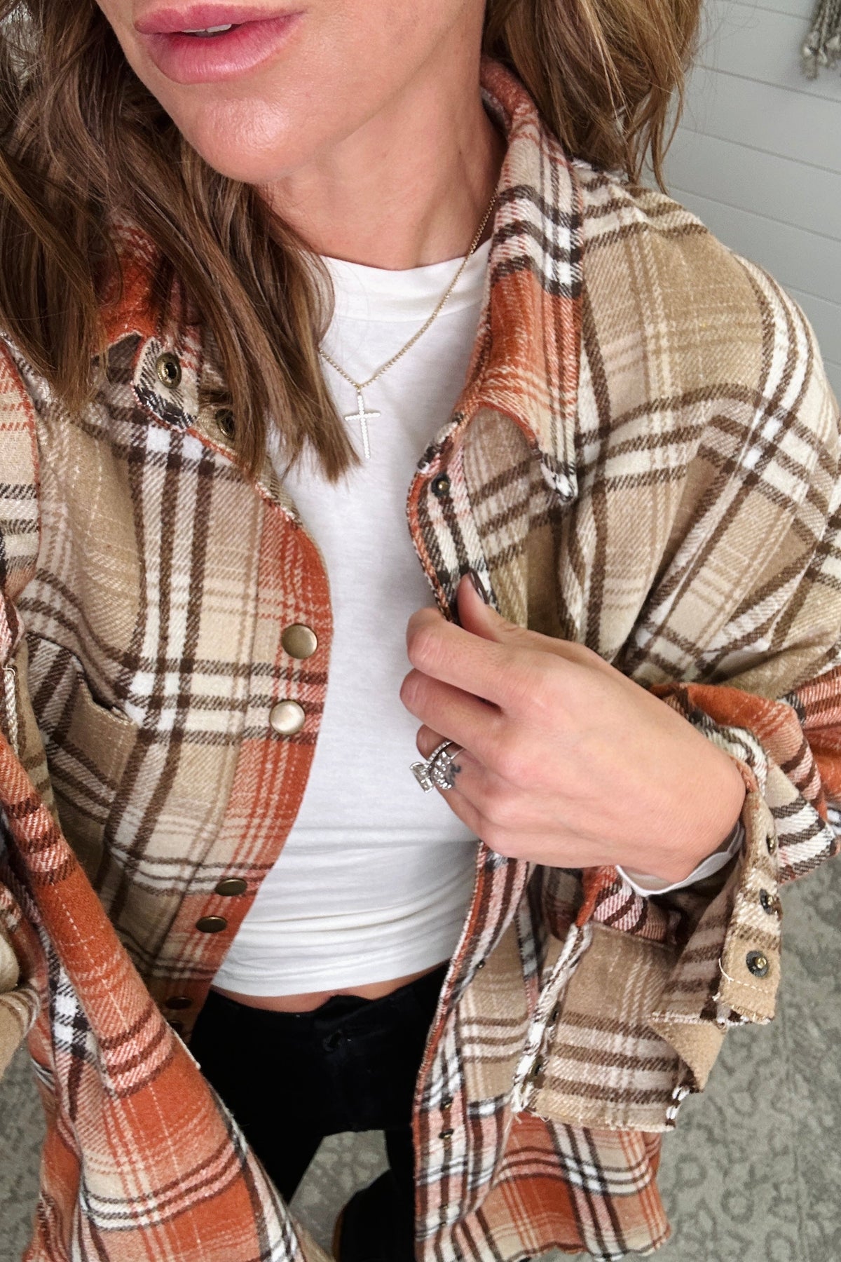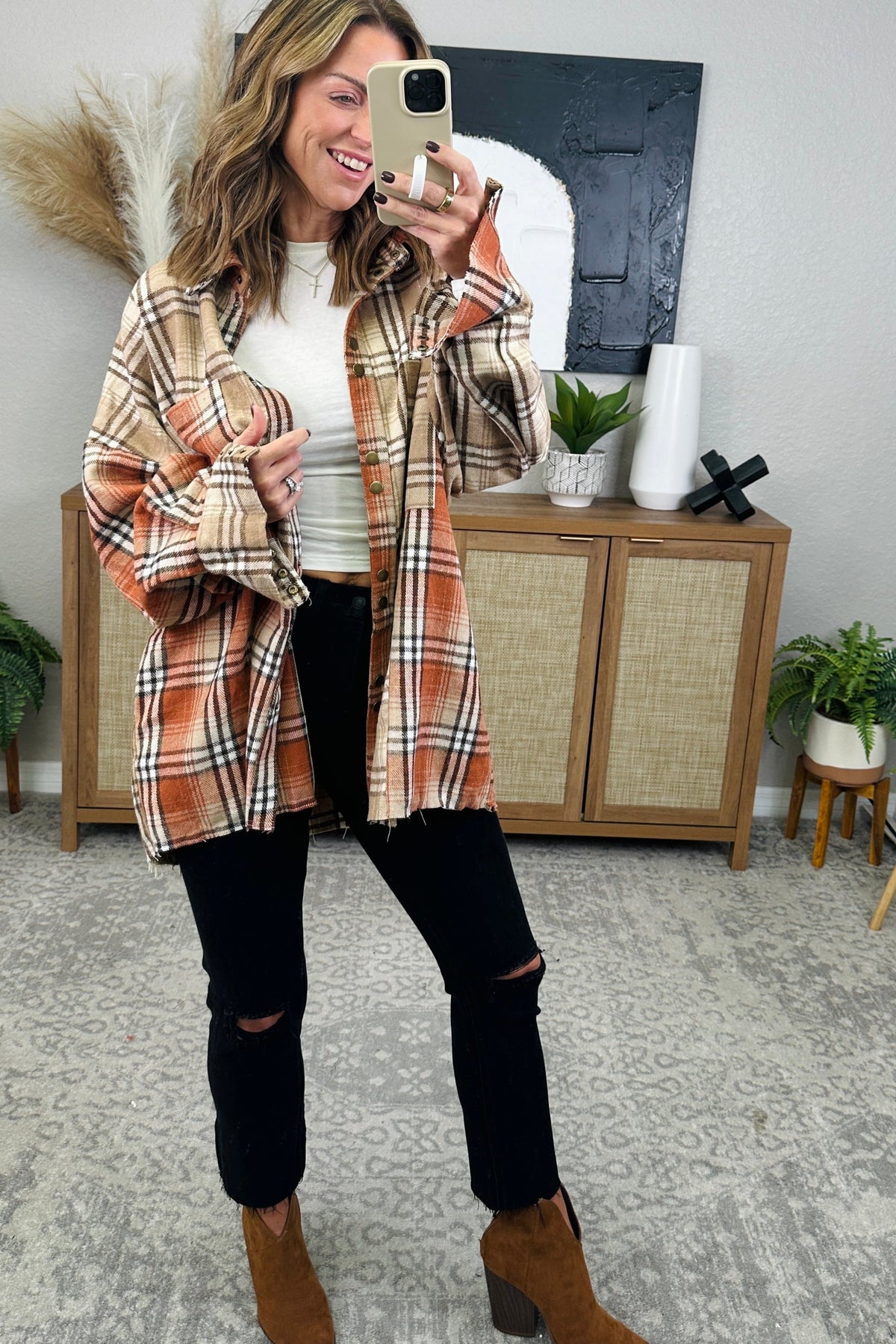 Get ready to snap into style with our Plaid Snap Down Dropped Shoulder Shacket! This versatile piece combines the comfort of a shirt with the warmth of a jacket, making it perfect for any occasion. Its relaxed fit and trendy plaid print will make you stand out in all the right ways. Snap it up now! The model is in the small, paired with Eileen jeans.