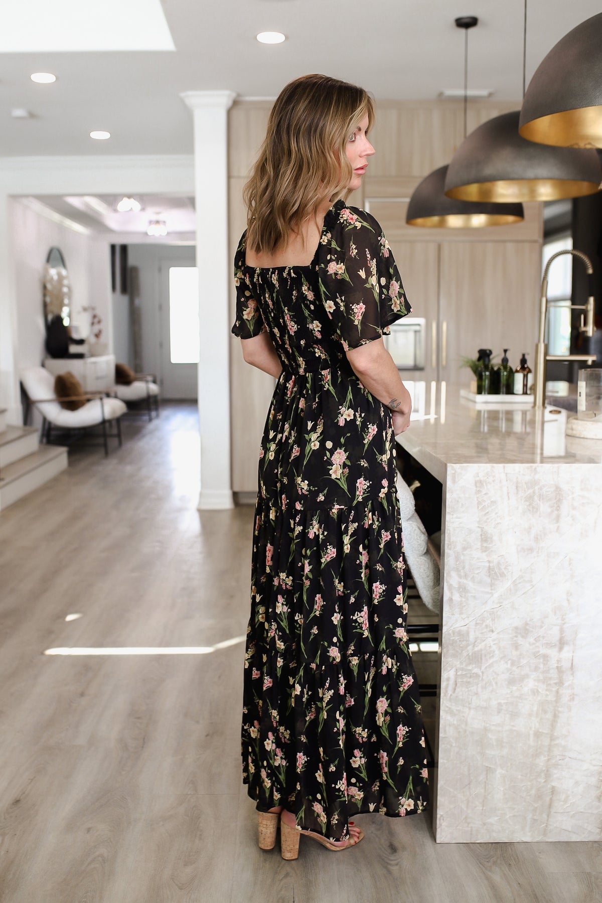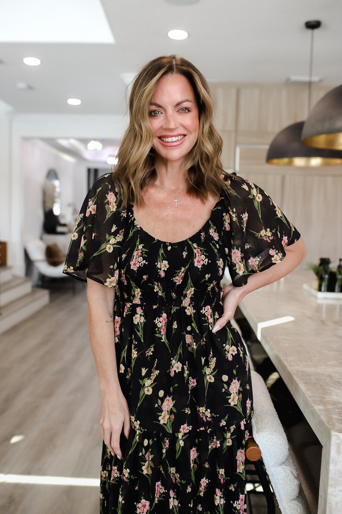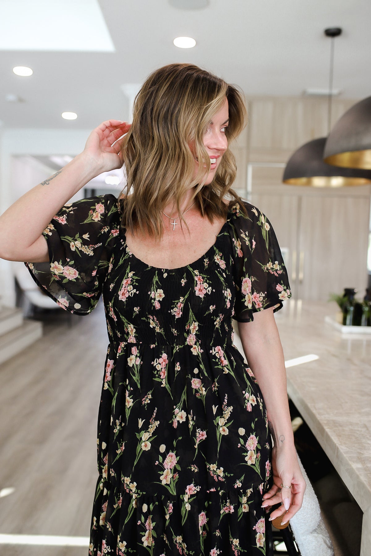 Bright, flirty, and effortlessly feminine, this short sleeve floral knit dress is a spring and summer essential. The square V-neck adds a modern touch, while the smocked bodice ensures a comfortable, true-to-size fit that flatters every figure. Made from lightweight knit fabric, it drapes beautifully and moves with ease, perfect for brunch, casual outings, or date night. Pair with sandals or sneakers for a playful, boutique-ready look. The model is in the small.