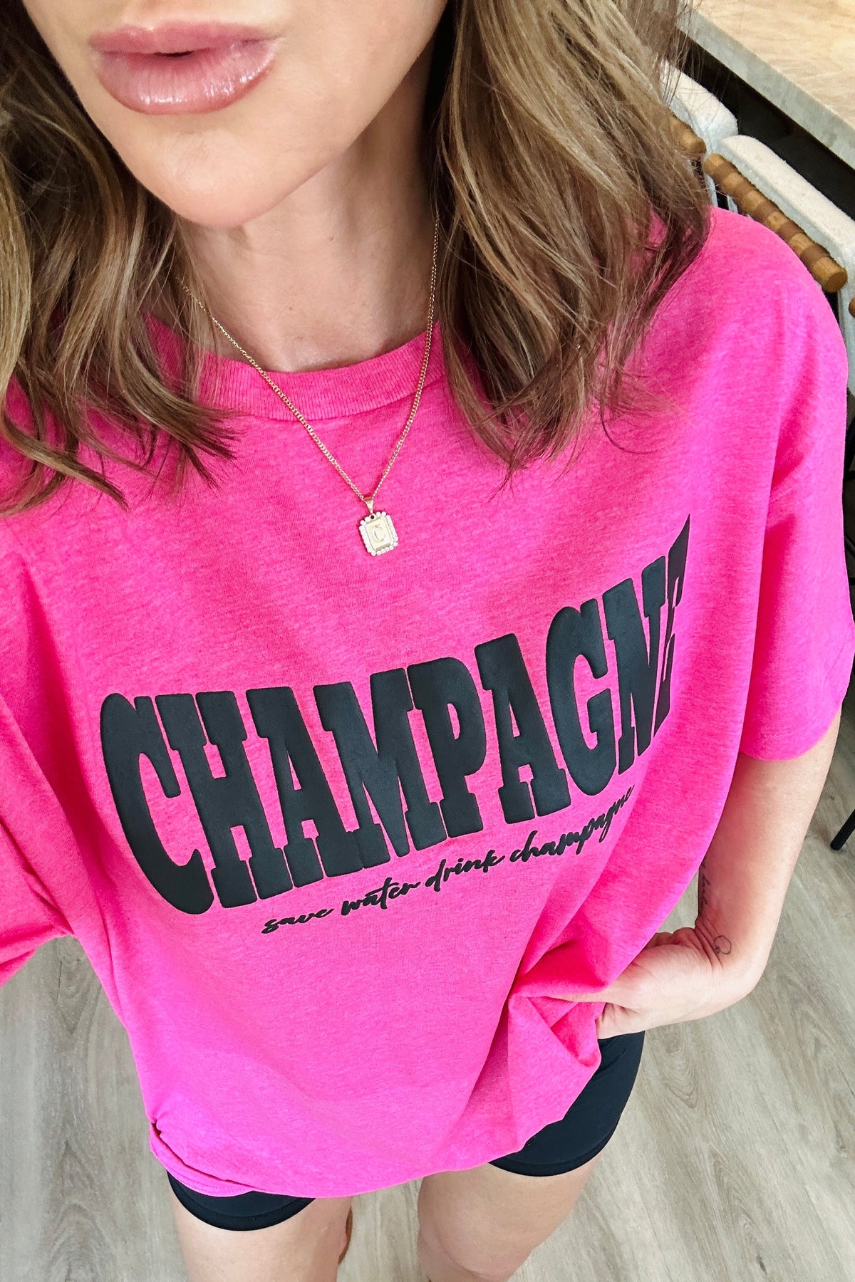 The model is in the Large natura, XL hot pink.