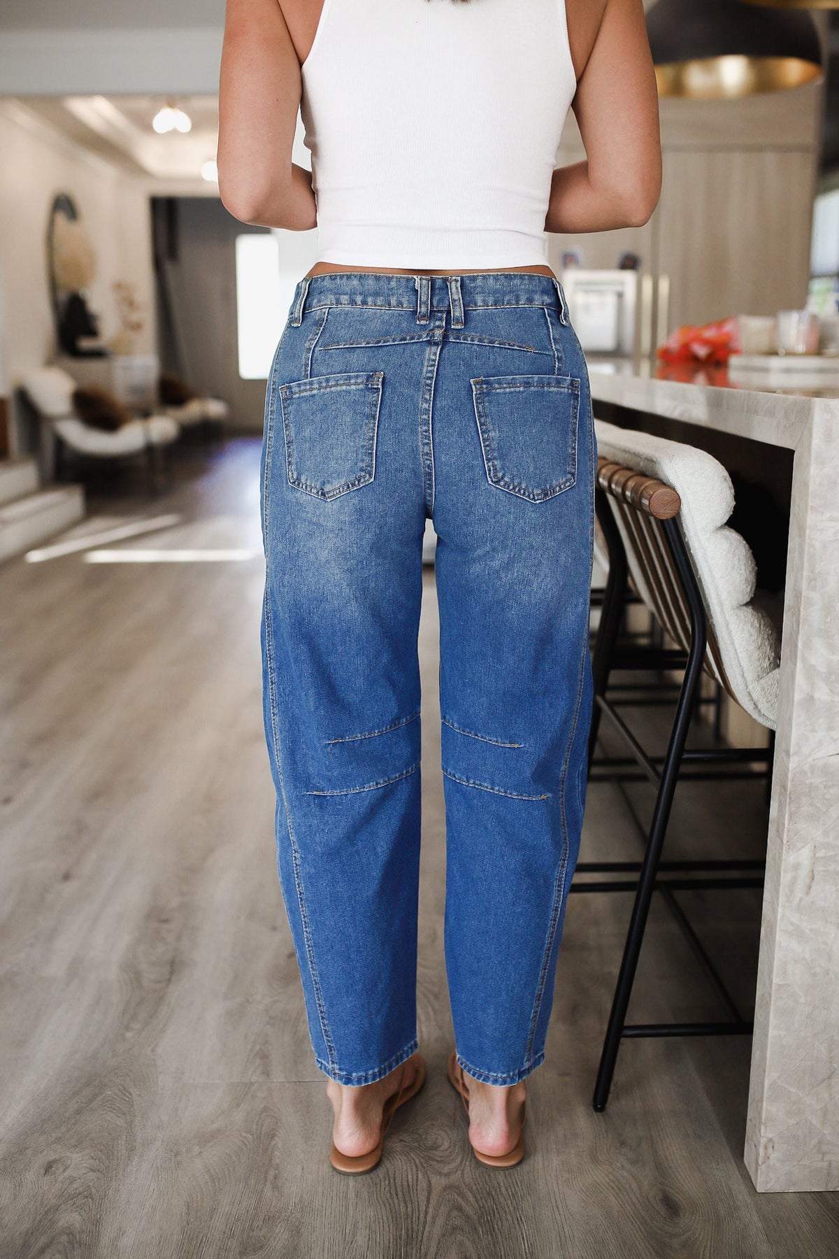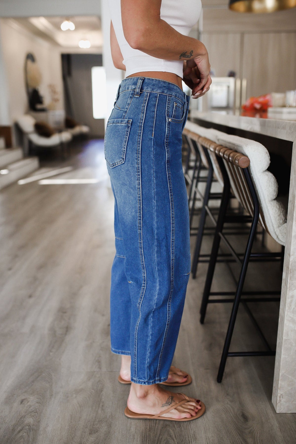 Looking for jeans that are as unique as you are? Check out our Wide Leg Jeans with Pockets! With a barrel leg design, these jeans will make you stand out from the crowd. Plus, the pockets provide both style and function. Perfect for anyone looking to add a little flair to their wardrobe. Rise:11", Inseam: 27" The model is in the medium.